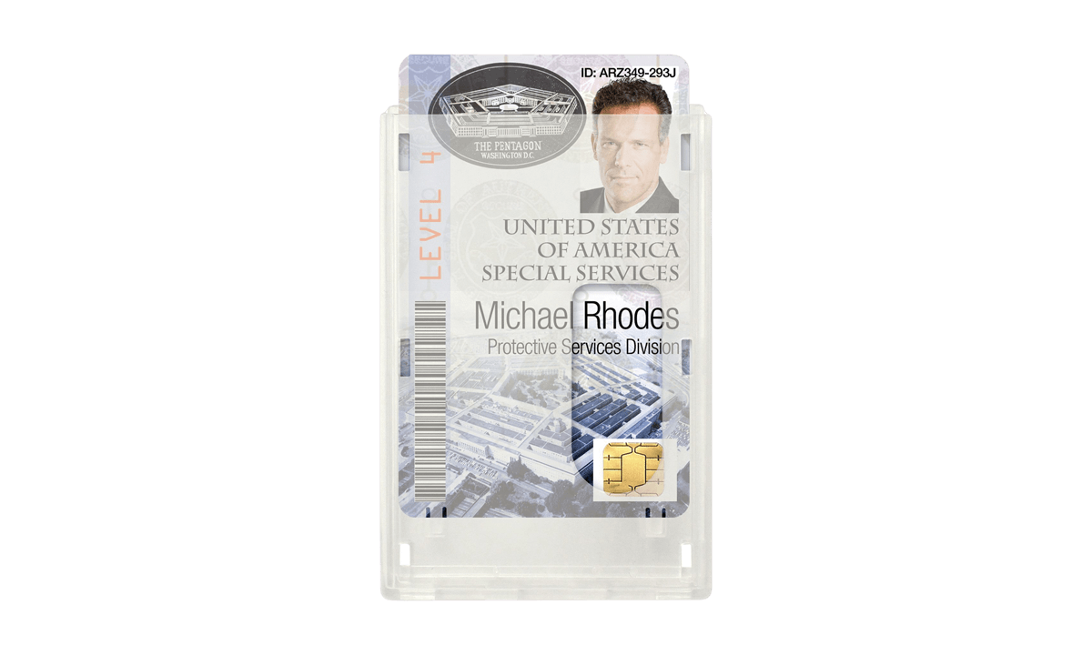 Besteht aus langlebigem, feuerhemmendem Polykarbonat. Der UV-Schutz verhindert ein Verblassen des Aufdrucks und sorgt so dafür, dass die Karte weniger häufig ersetzt werden muss. Die semi-transparente Oberfläche verbirgt Kratzer und vermeidet einen blendenden Glanz. Das Loch auf der Rückseite ermöglicht das einfache Anbringen an einem Schlüsselband oder einem Ausweisjojo mit Riemen.