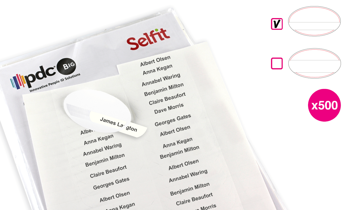 - Leichtes Abreißen und Einlegen in Ihre Selfit®-Namensschilder